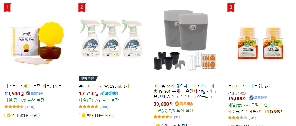 초파리 제거를 위한 제품을 다이소 등에서 구입하여 사용한다.