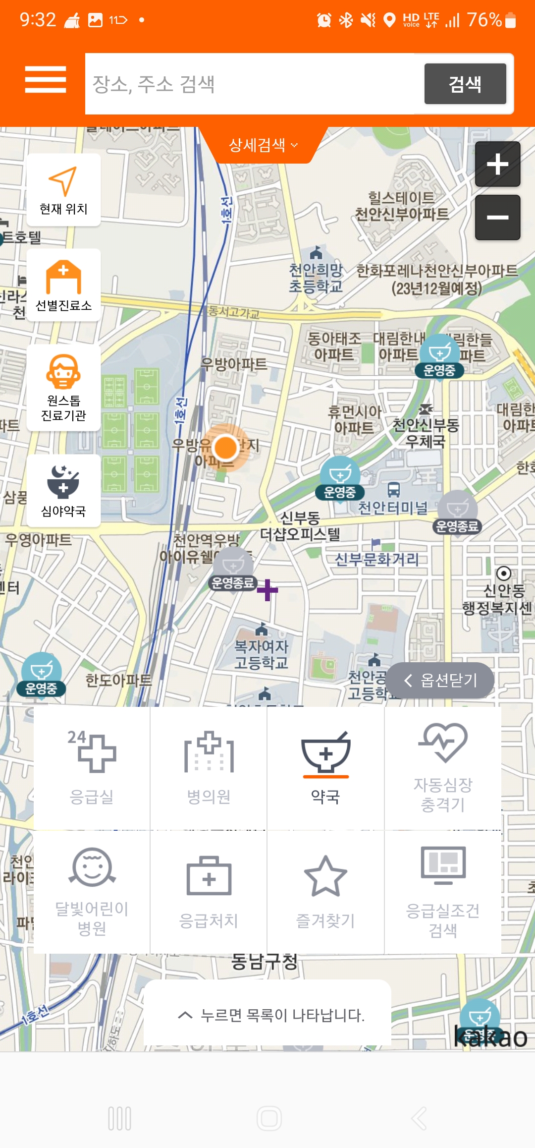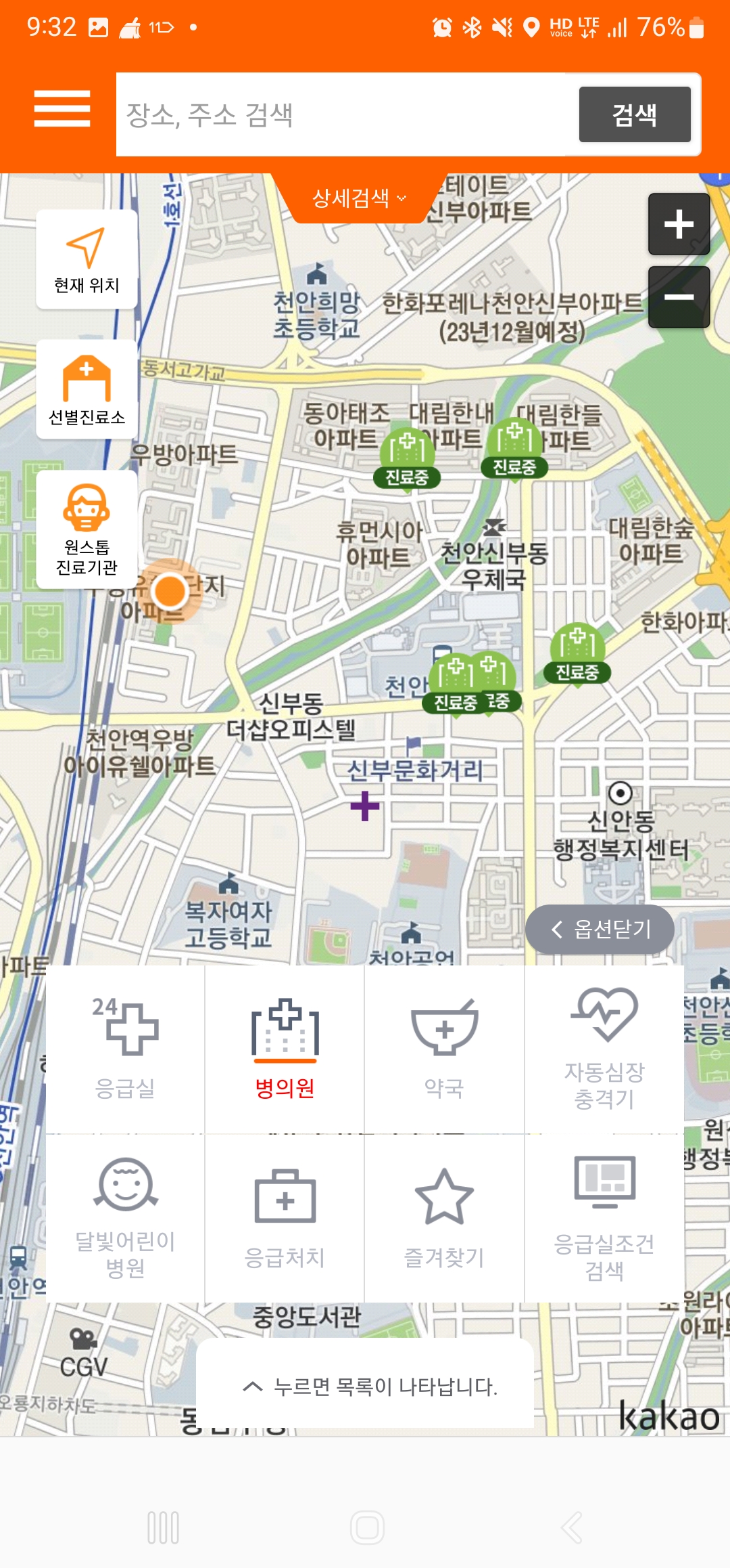 3. 아래에 있는 응급실, 병의원, 약국 등 확인하고자 하는 버튼을 누르시면 내 근처에 있는 진료하고 있는 병원 정보와 약국의 정보를 손쉽게 확인할 수 있습니다.