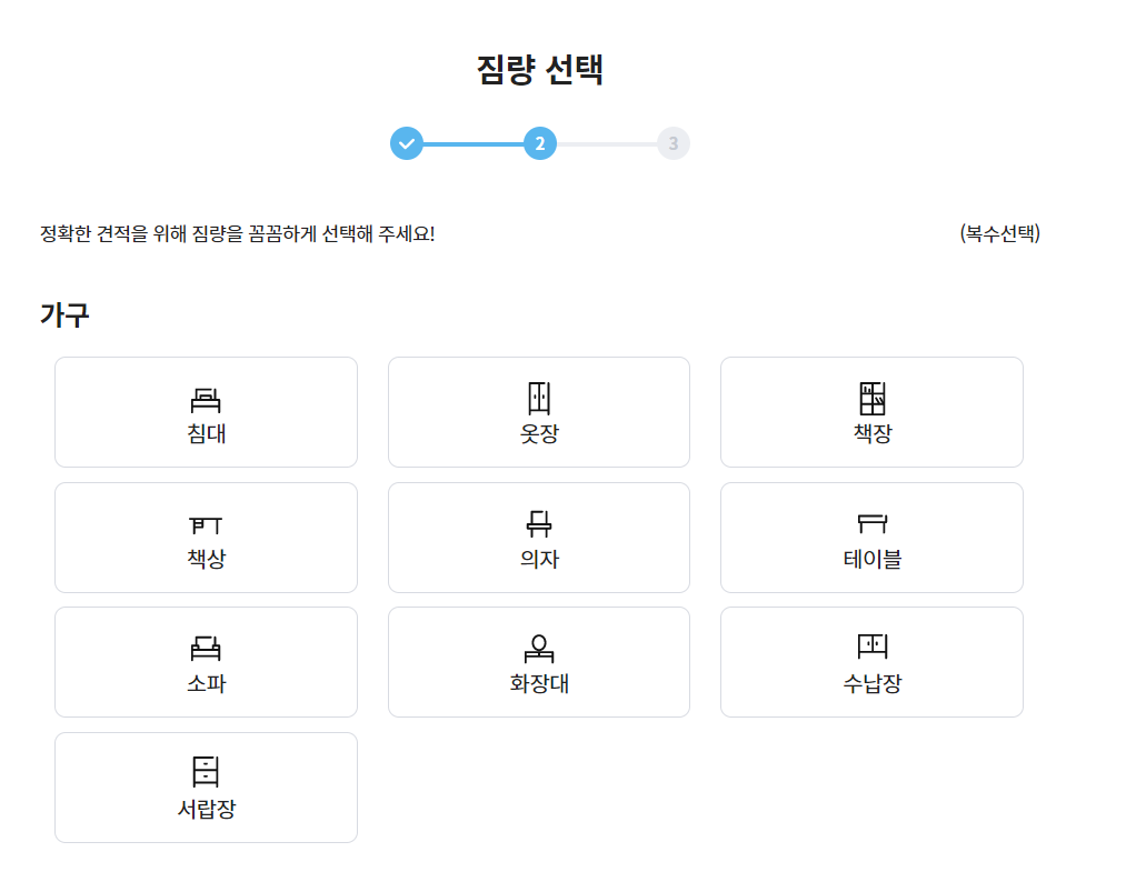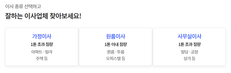 사이트에 접속하면 가정이사, 원룸이사, 사무실이사 이렇게 3가지 이사유형별로 선택을 할 수 있습니다.