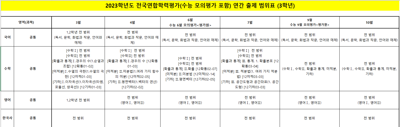 2023년 3월 모의고사부터 4, 6, 7, 9, 10월 모의고사 주요 과목 출제범위가 궁금하다면 위 버튼을 클릭하세요.