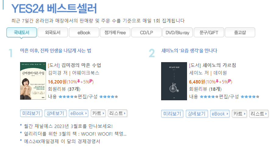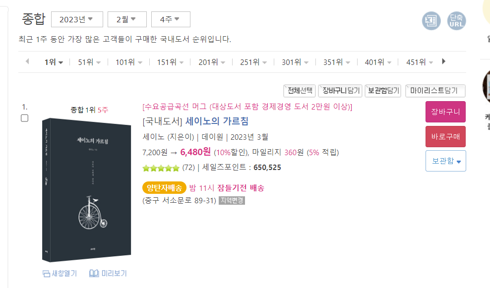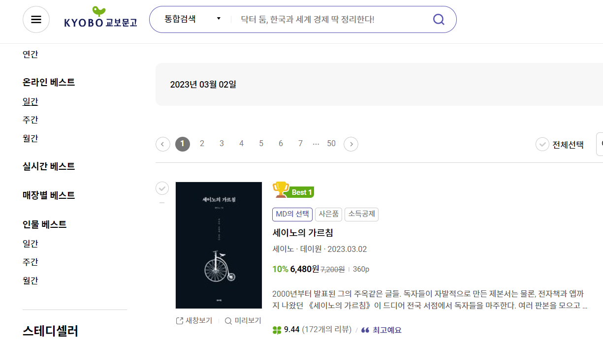 세이노 작가님의 새로운 생각이 반영된 "세이노의 가르침" 종이책이 발간된다는 소식에 책이 출간되기 전부터 예약구매가 엄청나게 이루어졌습니다. 지금 이 글을 쓰고 있는 2023년 3월 4일 현재 교보문고, 예스 24, 알라딘알라딘 베스트셀러 목록을 확인해 보았습니다.