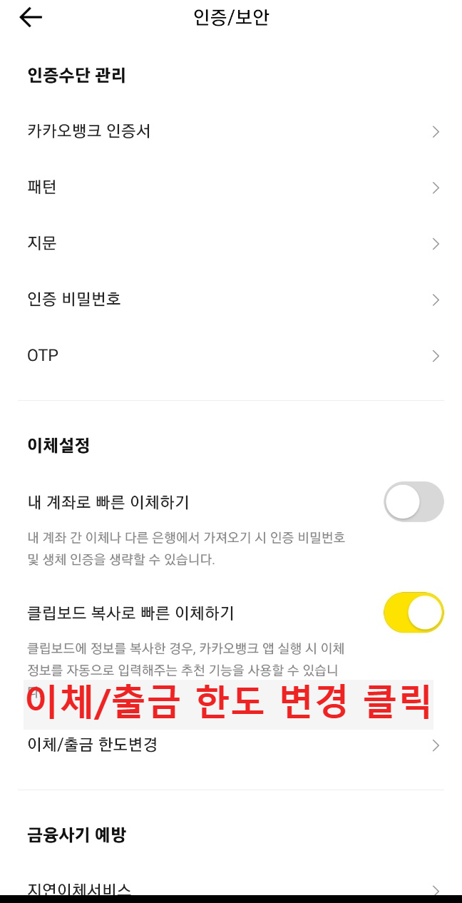 다른 은행들과 마찬가지로 카카오뱅크도 보안등급에 따라서 이체한도가 다릅니다.