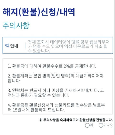 참고로요, 온라인으로 환불신청할 경우 수수료는 잔액의 2%가 적용됩니다.
