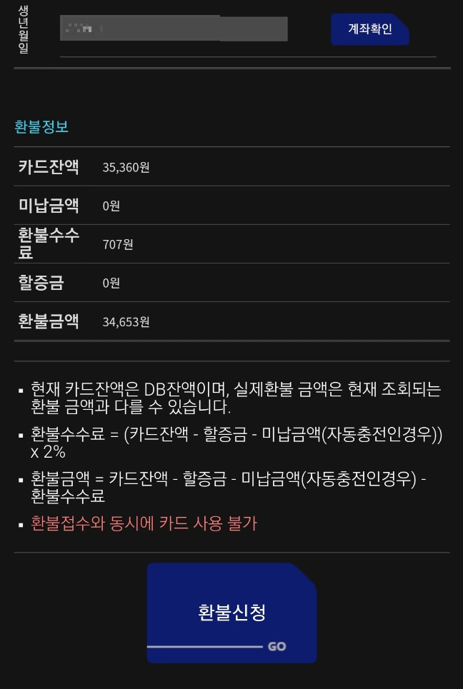 제 경우에는 카드잔액 3만 5천원정도가 남아있었는데 수수료 제외하고 3만 4천원 가량을 환불받았습니다.