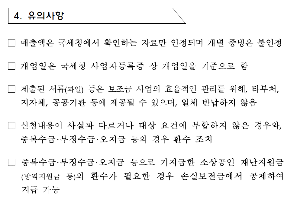 소상공인 손실보전금 신청 시 유의사항은 아래와 같습니다. 유의사항 꼭 확인하세요.