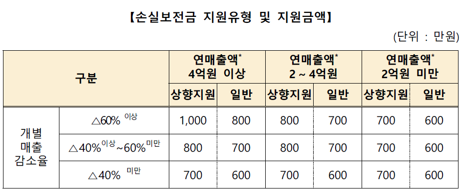 - 상향지원 대상의 경우 기본 700만원의 손실보전금이 지급됩니다.