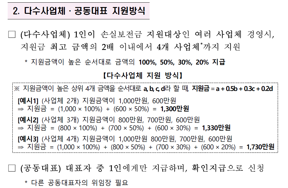 다수사업체를 운영하거나 공동대표인 사업장의 경우 아래와 같이 지원이 된다고 하니 참고하시면 좋을 것 같습니다.