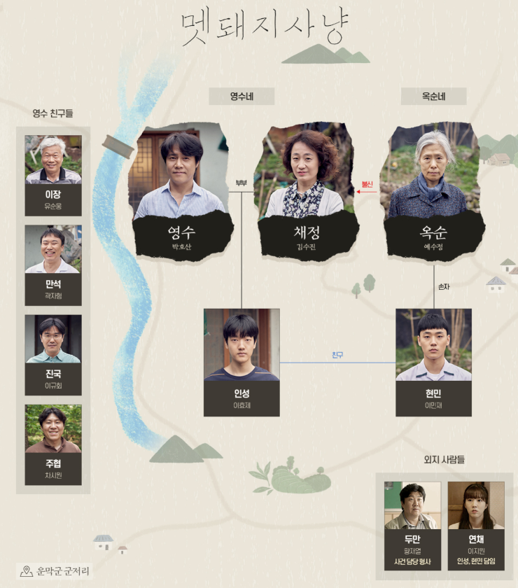 "멧돼지 사냥" 이야기는 주인공인 영수(박호산)네 가족과 옥순네가족, 그리고 마을사람들을 중심으로 진행됩니다.