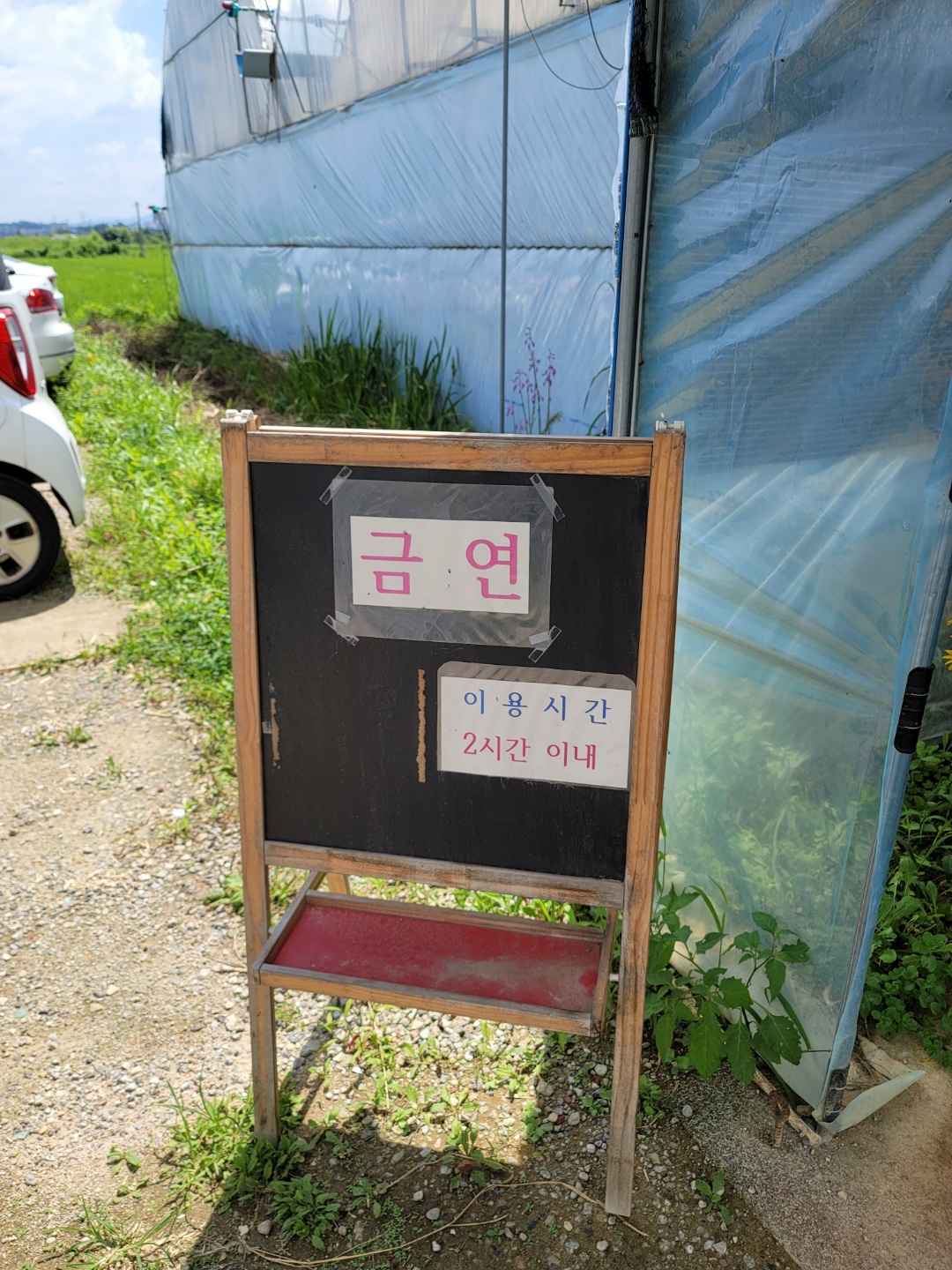 농장입구는 이런 모습입니다. 비닐하우스로 되어 있고, 금연 간판과 이용시간 2시간을 안내하는 문구가 우리를 기다리고 있습니다. 그리고 외부 먹이는 반입금지라는 내용도 부착되어 있어요.