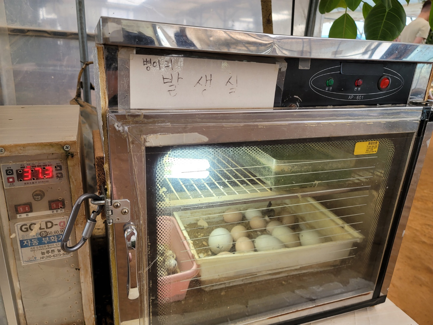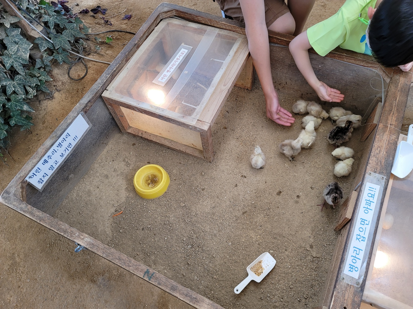 그리고 한 켠에 부화시설도 있었는데요, 때마침 태어난 병아리도 볼 수가 있었습니다. 아이도 신기해했지만 저도 처음 보는 것이어서 신기했어요.