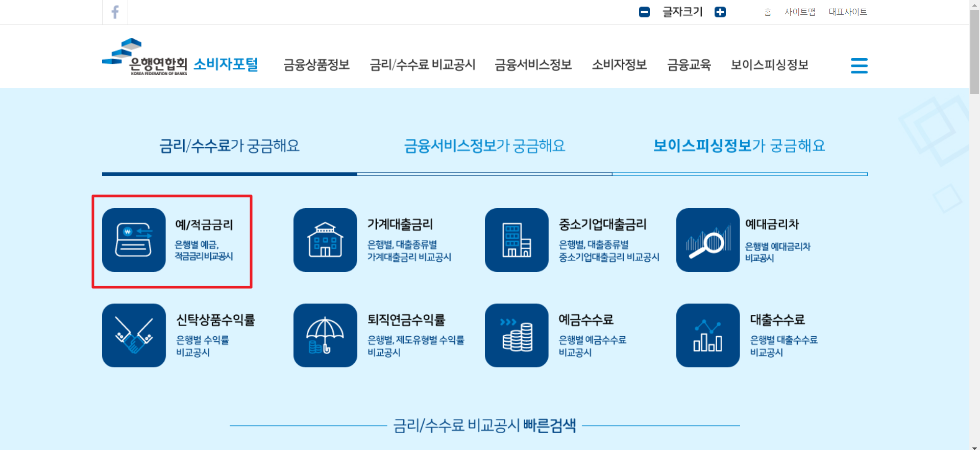 금융상품정보, 금리/수수료 비교공시, 금융서비스정보, 소비자정보, 금융교육, 보이스피싱정보