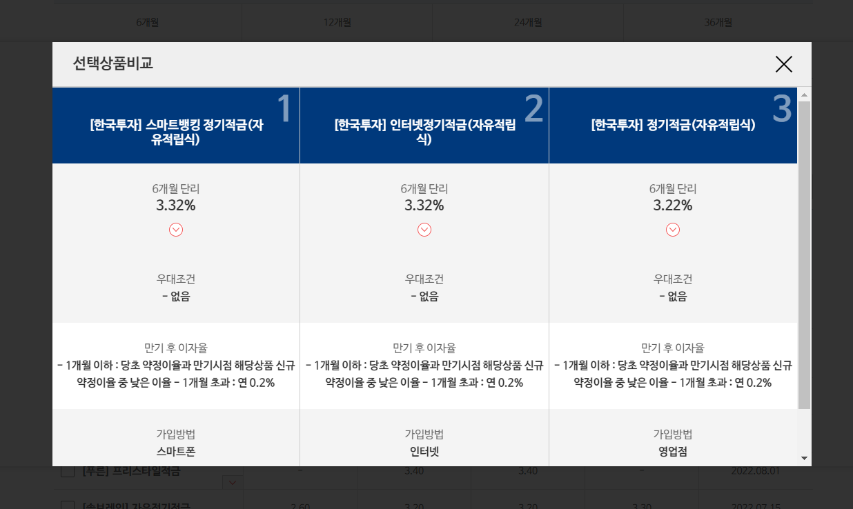 그런데 주의하실 점이 있습니다. 바로 자유적립식의 경우 월에 납입 가능한 한도가 금융상품별로 다른다는 사실입니다. 각 한도에 대해서는 검색 결과의 "상세정보" 열의 "보기"단추를 클릭해서 확인하실 수 있습니다.