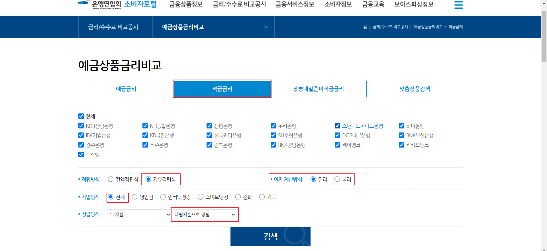 Step 3 : 금리비교 사이트에 원하는 방식을 설정한 후 검색합니다.