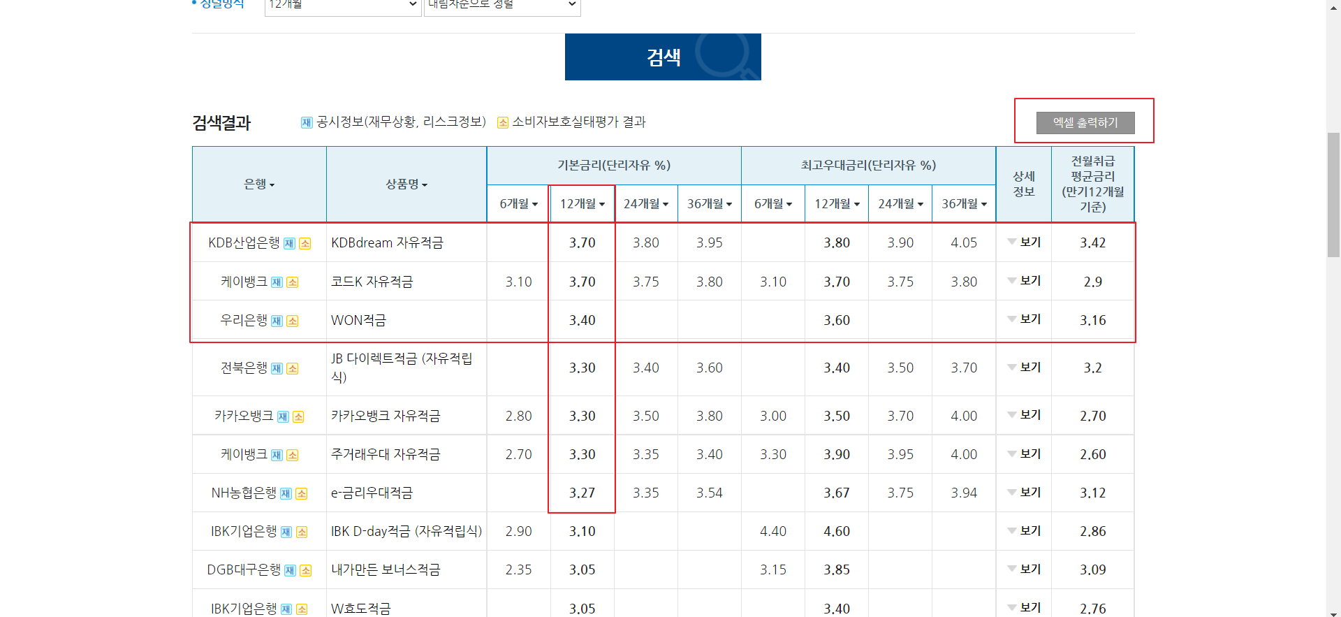 검색 버튼을 누르면 순식간에 각 은행별 상품명과 각 기간별 금리가 검색이 됩니다. 저는 기본금리를 기준으로 3개 상품을 비교해 보려고 합니다. KDB 산업은행의 KDBdream 자유적금, 케이뱅크의 코드 K자유적금, 우리은행의 WON적금 이렇게 3가지 상품의 12개월 가입 시 금리가 3.7%와 3.4%로 가장 높은 것으로 나왔습니다.