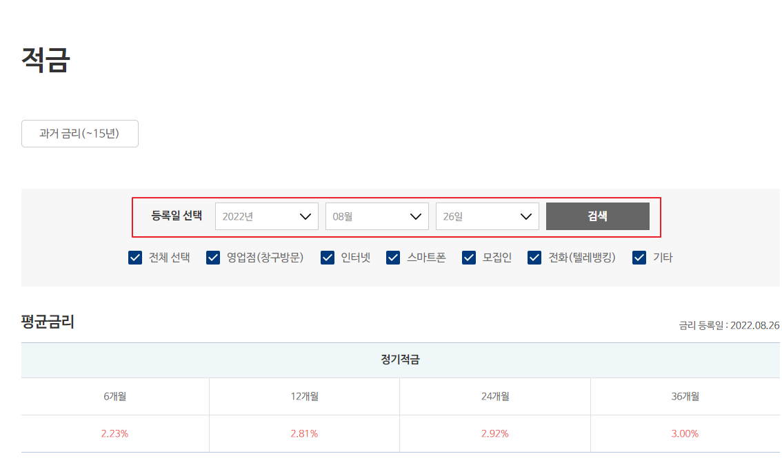 등록일은 검색하는 날을 선택해주시면 됩니다. 단, 주말이나 공휴일을 선택하면 검색이 되지 않는 것 같으니 만약 주말에 검색을 하신다면 가장 가까운 평일을 입력해주시면 될 것 같습니다. 그리고는 가입방식을 선택하면 됩니다. 저는 "전체 선택"을 클릭했습니다. 이후에 검색 버튼을 누르면 평균 금리 정보가 위의 사진과 같이 제공되고 그 아래에 우리가 원하는 금리비교 정보가 짜잔 하고 나타납니다.