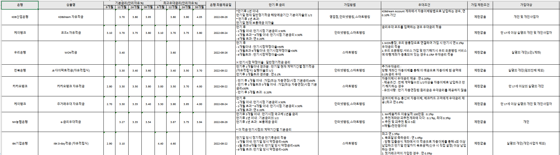 하지만 저는 이렇게 사이트 상에서 확인하시는 것보다는 "엑셀 출력하기" 버튼을 클릭하셔서 엑셀 파일을 다운로드하여서 보실 것을 추천드립니다. 엑셀 출력하게 되면 상세보기의 정보까지 모두 한눈에 볼 수 있도록 정보가 출력되기 때문입니다. 여기서 우대금리조건이라던가, 월 납입 가능 한도 정보를 한눈에 볼 수 있으니, 자신의 금융상품 가입 목적에 부합하는 상품을 찾으실 때 더 용이합니다.