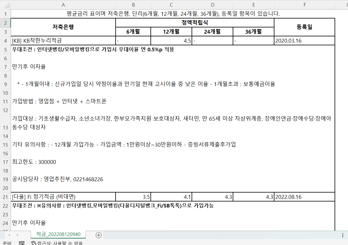 추가적으로 여기서도 검색 결과를 엑셀 파일로 다운로드하실 수 있는데요, 은행연합회와 마찬가지로 엑셀 파일을 다운로드하실 때 더 상세한 정보를 한눈에 볼 수 있습니다. 단, 표 형식이 은행연합회와는 달리 세로로 주욱 설명하는 방식이어서 보기는 불편하긴 했습니다.