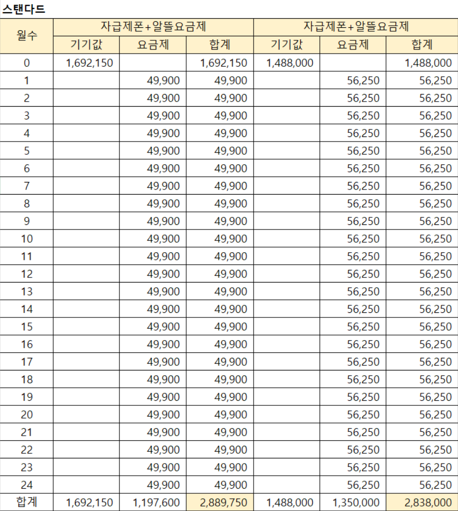 스탠다드요금제(150GB) 2,889,750원 2,838,000원 (+)51,750원
