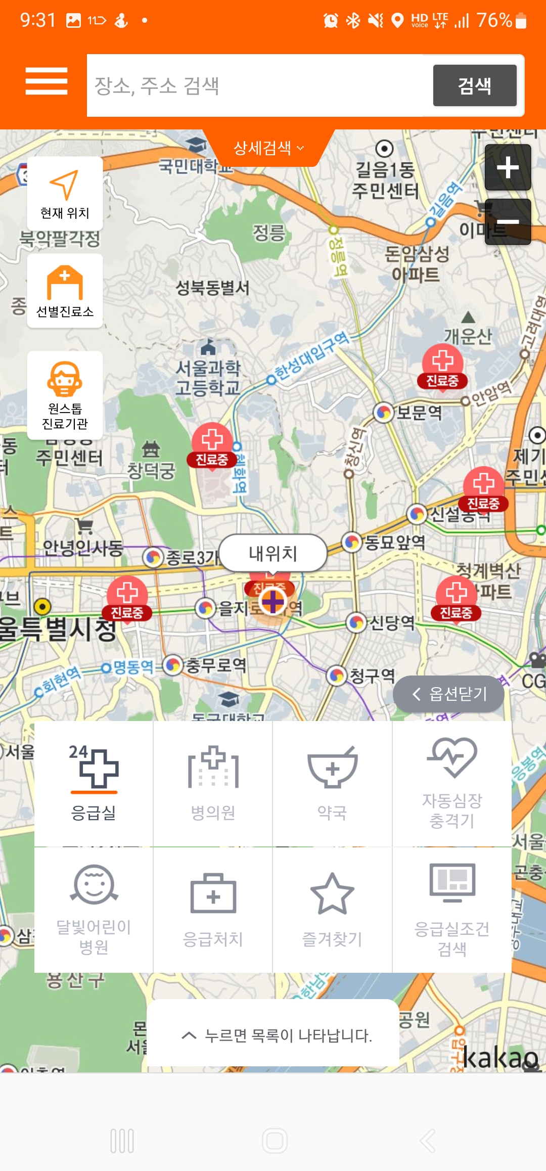 3. 아래에 있는 응급실, 병의원, 약국 등 확인하고자 하는 버튼을 누르시면 내 근처에 있는 진료하고 있는 병원 정보와 약국의 정보를 손쉽게 확인할 수 있습니다.