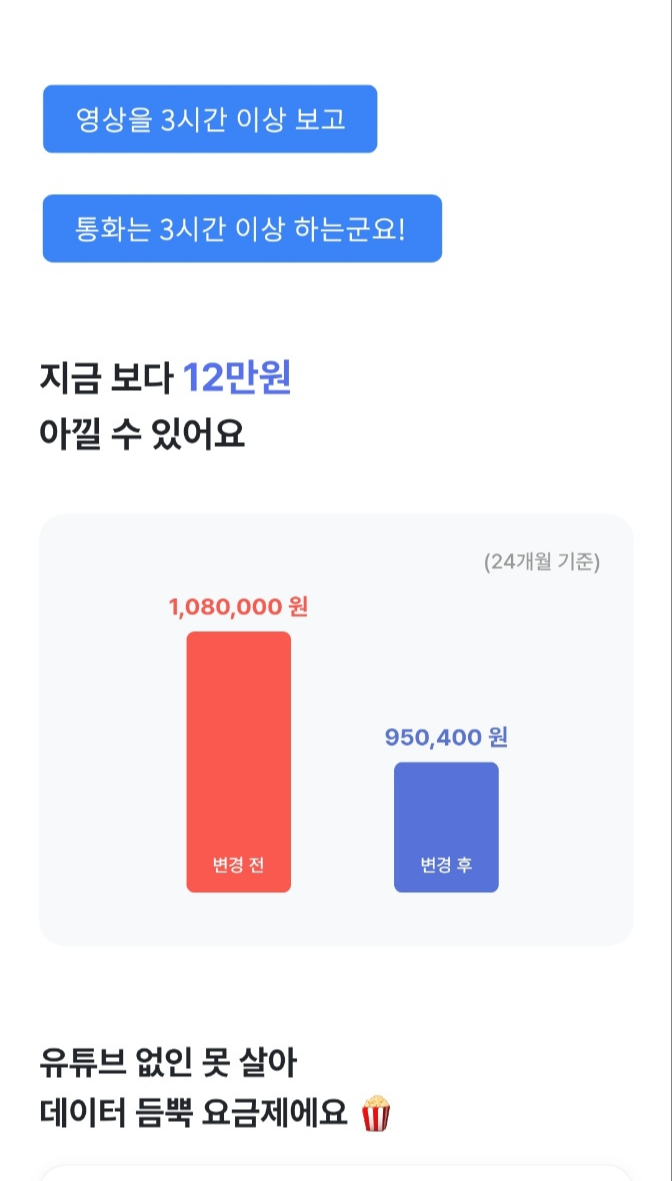 4. 8가지 질문에 답을 하고 나면 얼마나 아낄 수 있는지와 추천 요금제를 확인하실 수 있습니다.