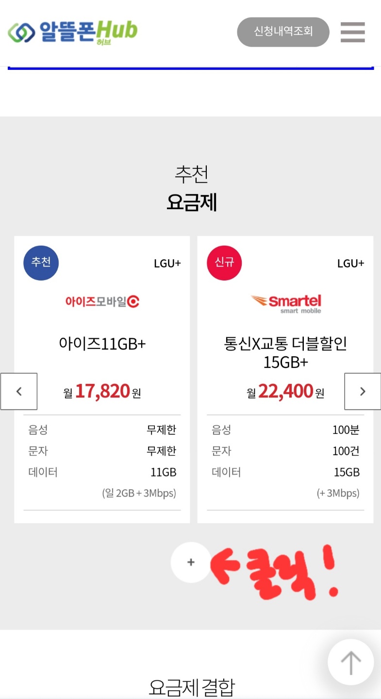 2. 알뜰폰허브 사이트에 접속하면 아래 그림이 나옵니다. 스크롤을 아래로 내리시면 + 모양 버튼이 보일 겁니다. 해당 버튼을 클릭합니다.