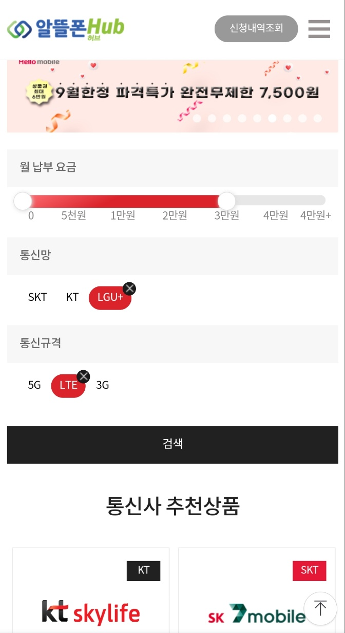 3. 들어가셔서 생각하고 있는 월 납부 요금 범위와 통신망(SKT, KT, LG U+), 통신규격을 선택합니다. 저는 월 납부 요금 3만 원 이하에 LG U+망을 사용하려고 합니다. 굳이 5G를 사용하지 않아도 된다고 생각해서 LTE를 골랐습니다.