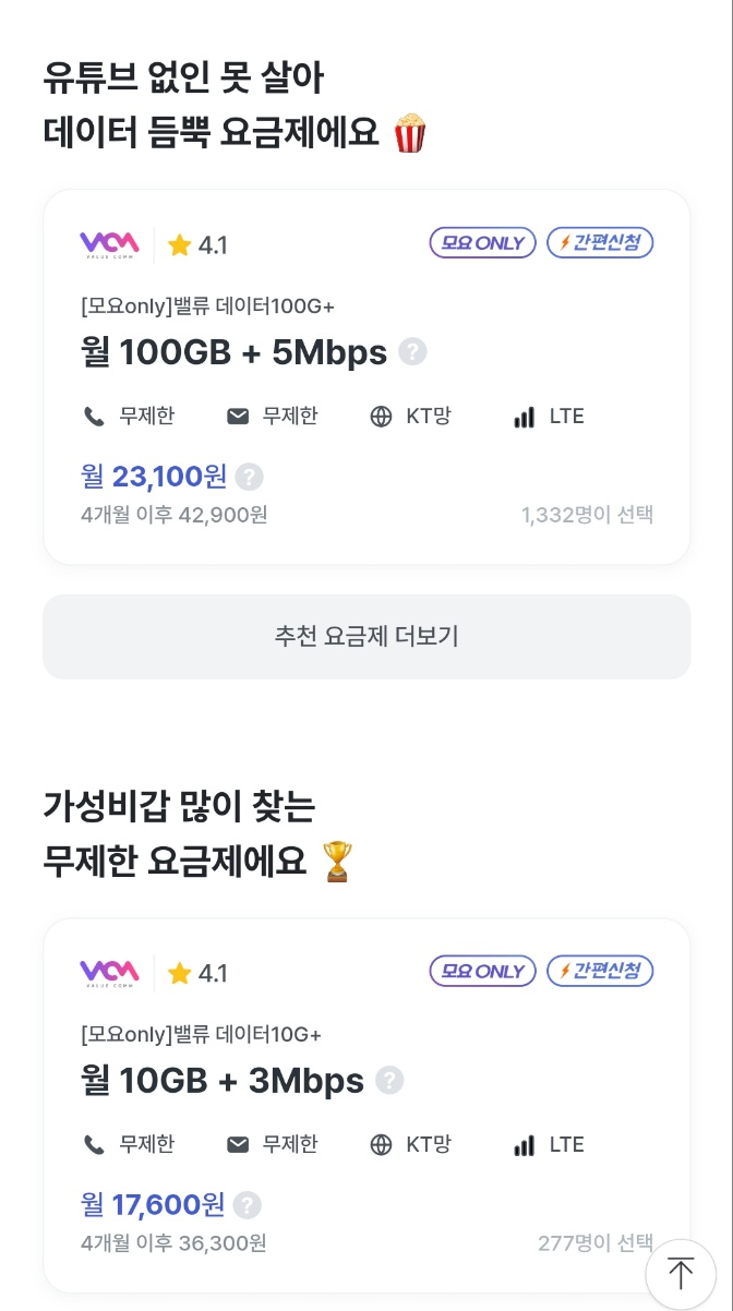 아무쪼록 사이트 접속해서 본인이 원하는 요금제를 찾으셨길 바랍니다.