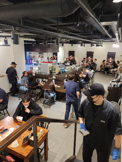 위에 사진은 부타이 계단을 다 내려와서 본 식당 입구 풍경입니다. 얼추 보이는 4인 식탁이 7개(3*7=21명, 보면 4인보다는 2인씩 온 분들이 더 많아서 평균 3인이 앉는다고 가정), 바처럼 생긴 곳에서 앉아 먹을 수 있는 인원이 약 18명 정도 될 것 같았어요. 그럼 1번에 소화할 수 있는 최대 인원이 약 40명 정도란 걸 어림짐작으로 알 수 있습니다. 보통 2~3 사람 짝지어서 오니까 20팀 안에 들지 못하면 오픈런은 꽝이란 걸 알 수 있습니다.