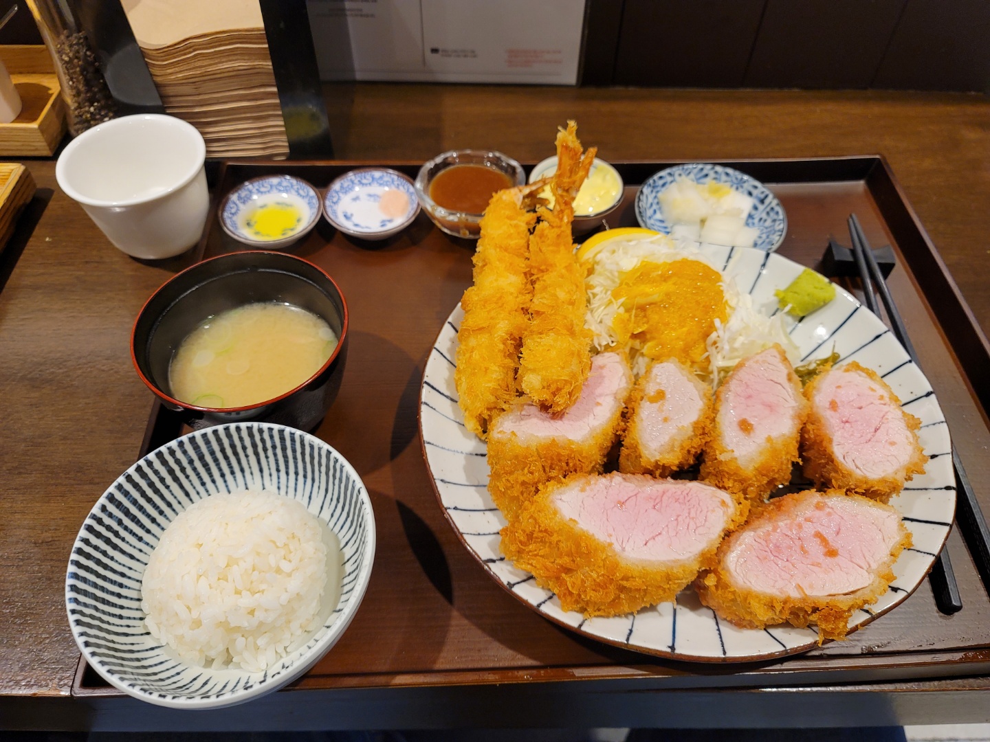 그런데 그렇게 커서 퍽퍽할 것 같은 돈가스가 엄청나게 부드러웠습니다. 옛날 요리왕 비룡에서 자주 보던 두 글자가 떠올랐습니다. 미미!!! 예상을 깨는 부드러움에 제 마음과 혀는 이미 녹아버렸습니다. 그러고 나서 새우튀김을 먹어보았어요. 그런데 이게 또 끝내줍니다. 겉바속촉의 진수였습니다. 겉은 바삭, 속은 촉촉한데 우와 크기도 엄청나서 새우튀김만 먹어도 배부를 것 같았습니다. 하지만 저는 남김없이 다 먹었어요. 정말 맛있었습니다.