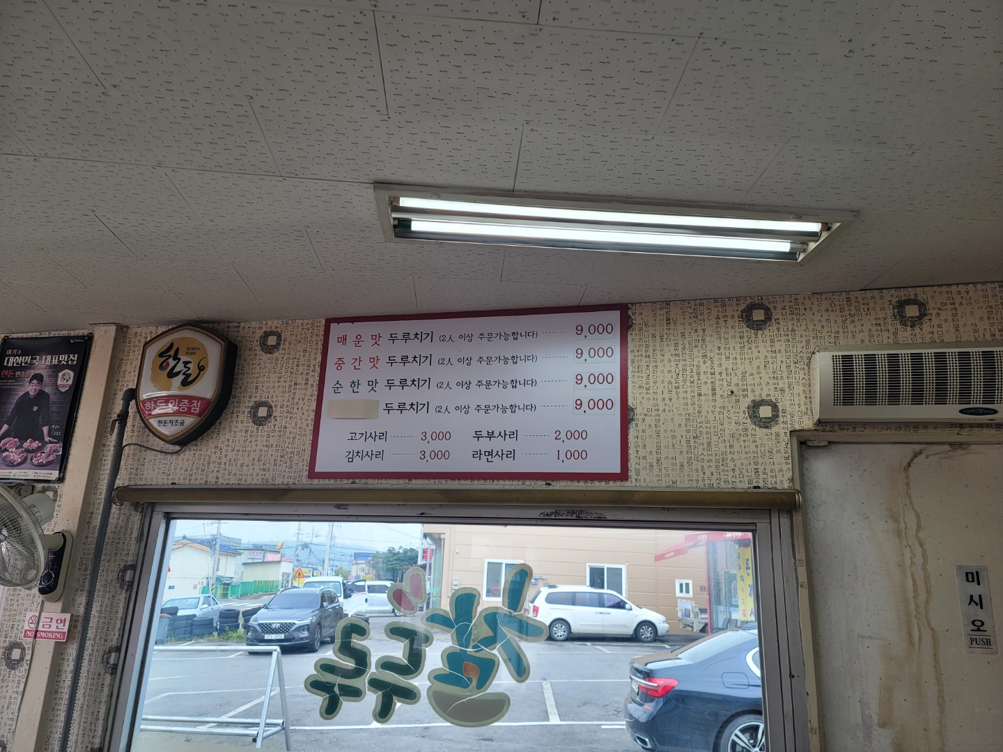 겉모습도 맛집 같았는데, 안은 더 그렇습니다. 훈민정음 벽지를 바탕으로 두고, 맛집답게 간단한 메뉴판이 우리를 기다리고 있습니다.