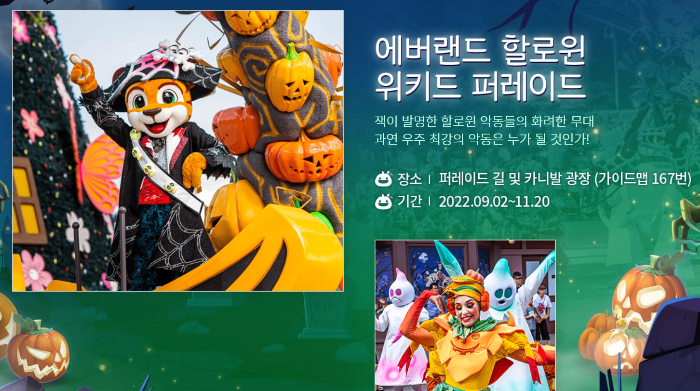 에버랜드에서는 2022년 9월 2일부터 11월 20일까지 아래와 같이 할로윈데이 컨셉으로 퍼레이드 등을 진행한다고 합니다.