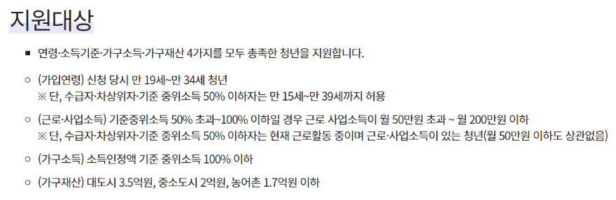 신청 당시 근로 중인 만 19~34세 청년 중 근로소득 및 사업소득이 월 50만원 초과~ 200만원 이하여야 합니다.