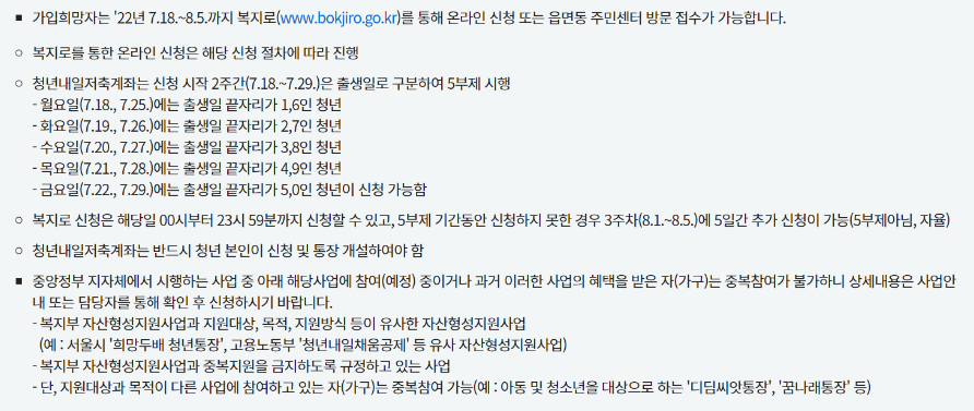 2022 청년내일저축 계좌 가입신청은 7월 18일 8월 5일까지 진행하며