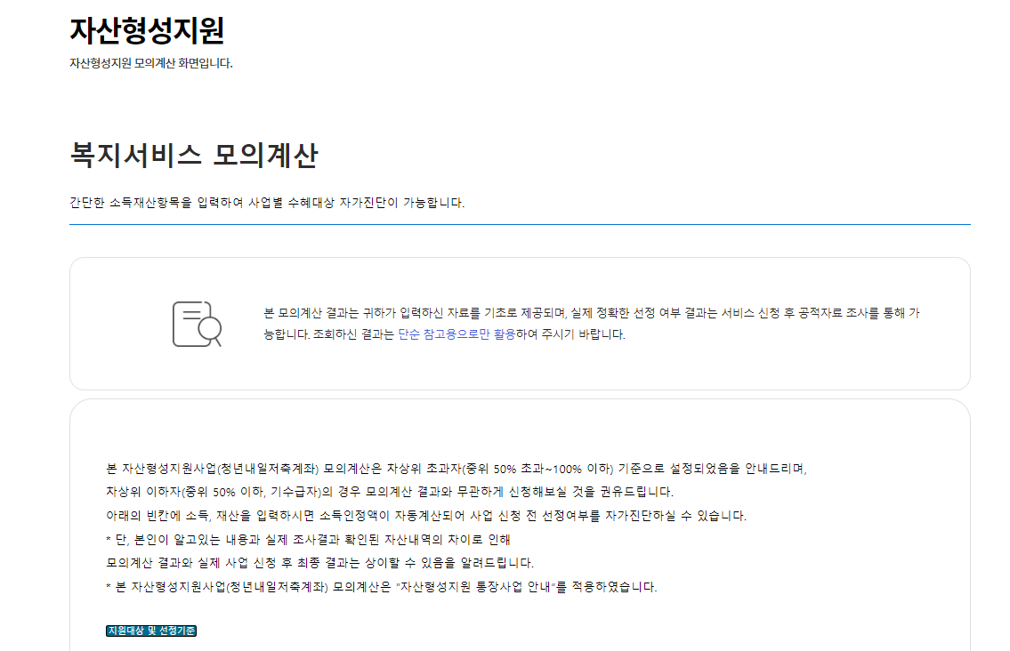 신청하시기 전에 복지로 홈페이지에 미리 방문하여 "자산형성지원 사업 모의계산"을 통해 본인이 대상자인지 자가진단을 미리 할 수 있다고 하니 참고하세요.