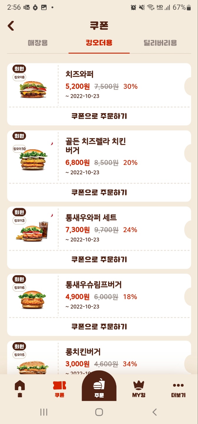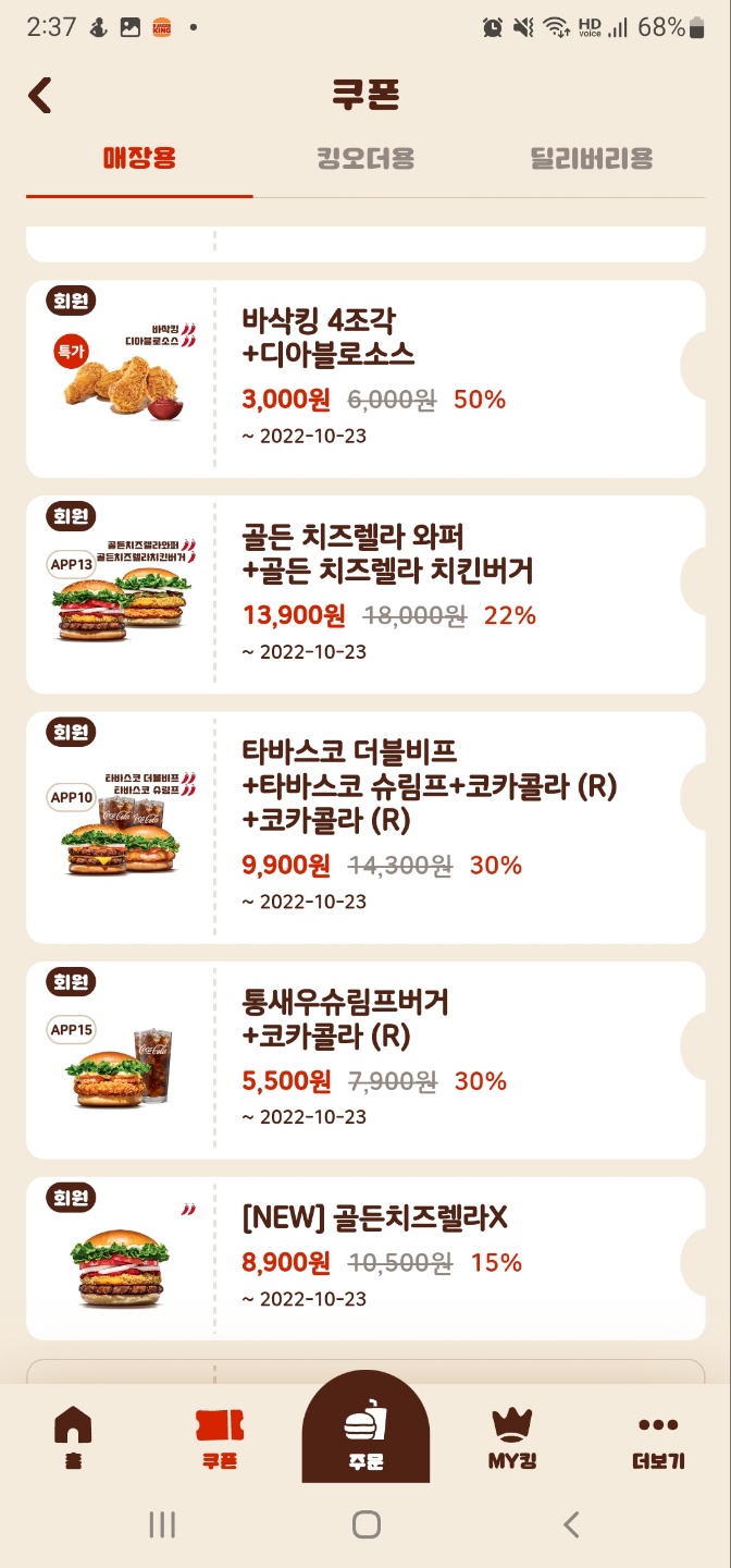 혹시나 버거킹 신메뉴 중 골든치즈렐라 와퍼와 골든치즈렐라치킨버거를 맛보고 싶으다면 버거킹 앱을 다운로드 하시고, 회원 가입 하신 후에 단품 2개 구매하는 할인쿠폰을 활용하시는 게 가장 저렴한 방법일 것 같습니다.