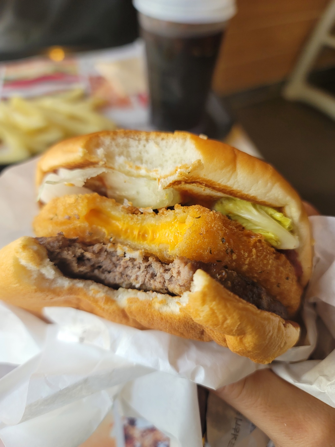 우선 첫 인상은 만족스러웠습니다. 한 손으로 버거를 잡아 드는데 묵직합니다. 먼저 받아서 한 입 베어문 동료가 "우와 이거 맛있다."라고 감탄하면서 먹고 있어서 저도 엄청 기대되었습니다. 한 입 베어물었더니 패티에서 광고에서 보던 그 노오란 치즈가 흘러 나옵니다.