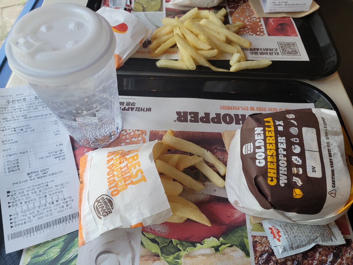 버거 무게 만큼이나 묵직한 맛이었습니다. 여러가지 소스들이 어우러져 있었습니다. 다만 저는 와퍼세트를 시켰기 때문에 와퍼 특유의 그 "불 향"을 기대했었는데, 소스랑 치즈패티의 맛이 강렬해서 기대했던 스모키한 맛은 느낄 수 없었습니다. 가격이 무려 9500원이긴 했지만, 포만감은 9,500원 값어치를 충분히 한 것 같습니다. 먹고 나서 저녁까지 배가 전혀 고프지 않았습니다.