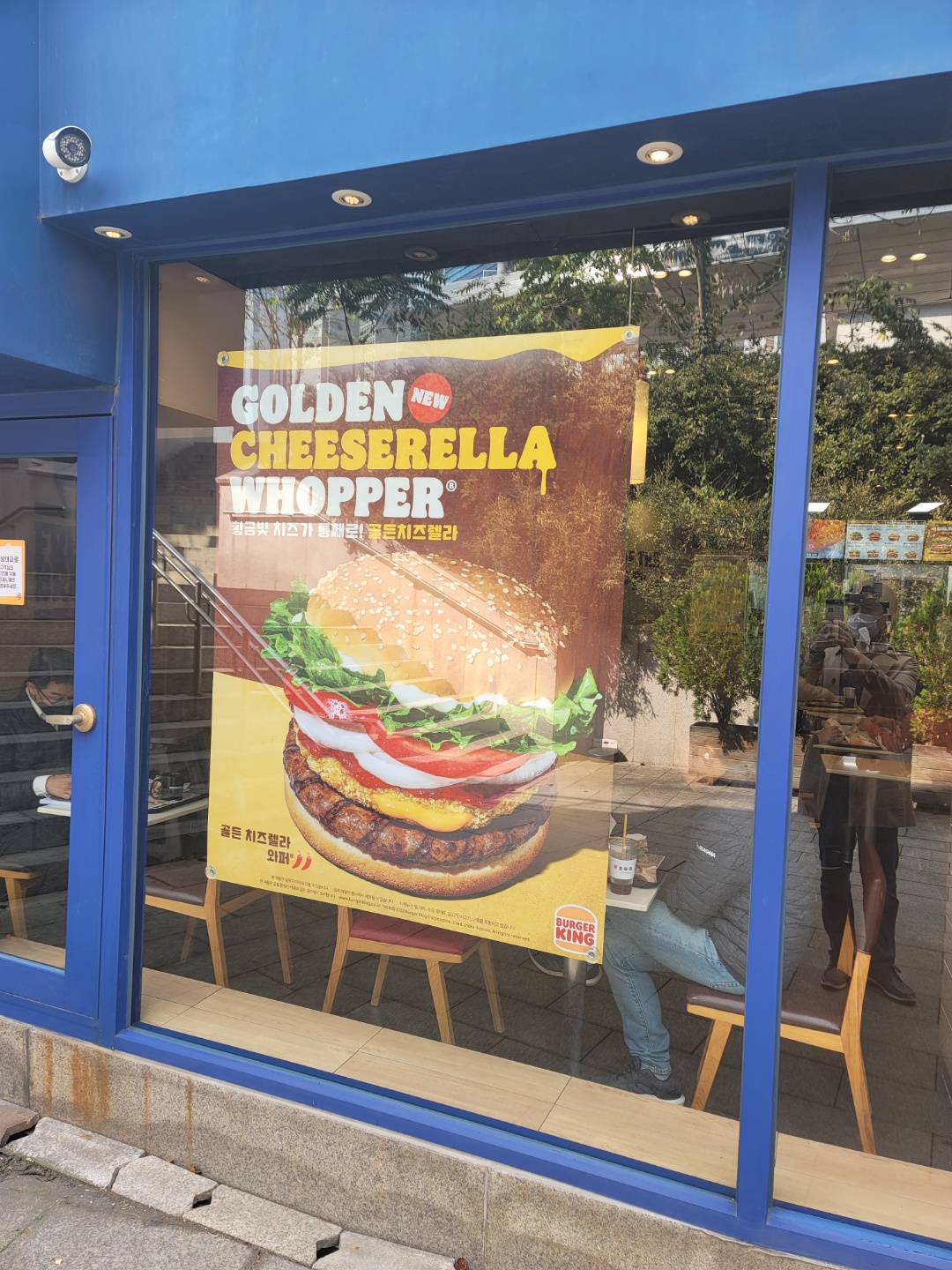 버거킹은 맥도날드나 롯데리아에 비교해서 양도 많고, 그래서 가격도 더 비싼 편입니다. 그래서 할인쿠폰 없이는 자주 안 가게 되는 편입니다. 그런데 이번에 직장 동료와 함께 회사 근처 버거킹에 가게 되었습니다. 양재역 입구에 있는 버거킹에 방문하니 신메뉴인 골든치즈렐라 와퍼 홍보 포스터가 떡하니 붙어있었습니다.