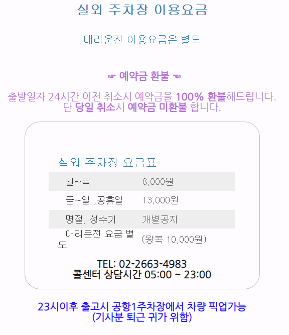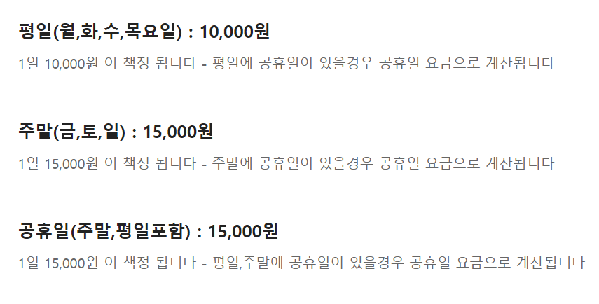 24시간 기준 요금은 월~목요일은 2만원, 금~일요일 및 법정공휴일은 3만원입니다.