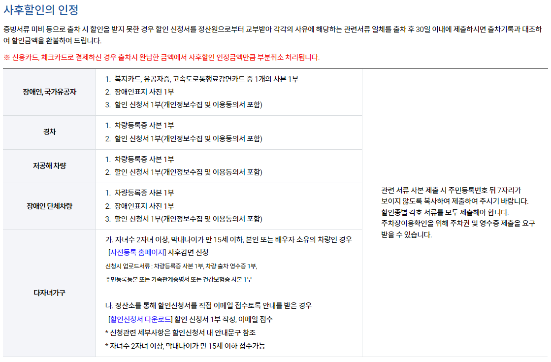요즘에는 증빙서류 미비로 할인을 받지 못한 경우에 출차 후 30일 이내에 할인신청서를 제출하기만 하면 할인금액을 돌려 받을 수 있다고 합니다.