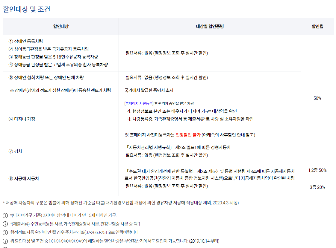 장애인가구가 아니라면, 다자녀 가정 혜택 혹은 경차 혹은 저공해자동차를 이용하여 50%할인을 받을 수 있다고 정리하면 될 것 같습니다.