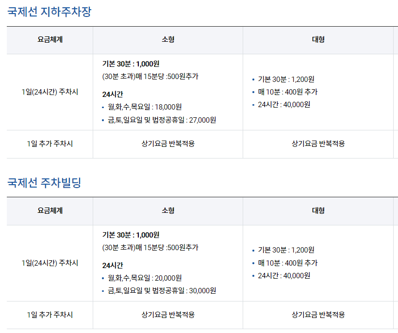 소형차 기준으로는 국제선 주차비가 가장 저렴하고, 국내선과 화물청사주차장은 요금체계가 동일합니다.
