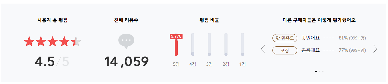 - 리뷰현황 : 네이버쇼핑에서 2번째로 리뷰가 많은 업체였습니다. 총 1만 4천건의 리뷰 중에서 9,776건이 5점을 받았습니다. 약 70% 수준으로 아르뫼에 비하면 5점의 비중이 낮았습니다. 맛있다는 리뷰가 81%, 포장이 꼼꼼하다는 것도 77%로 아르뫼에 비해서 낮게 나타났습니다.