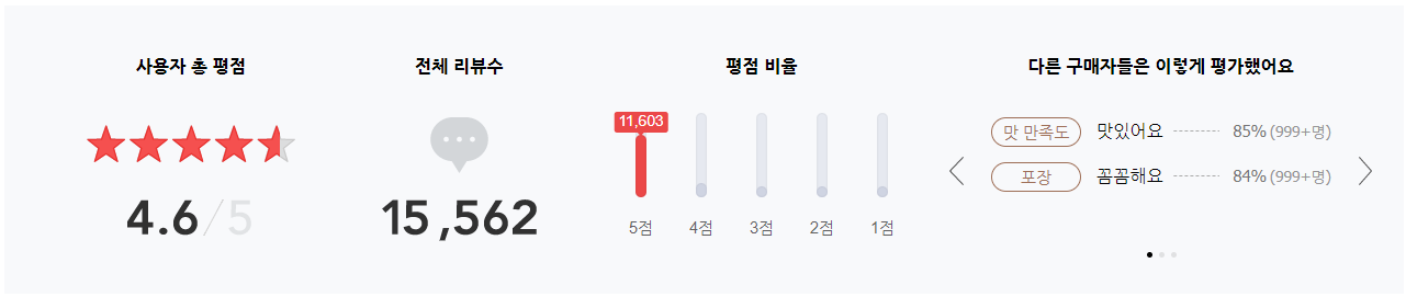 - 리뷰현황 : 네이버쇼핑에서 가장 리뷰가 많은 업체입니다. 총 1만 5천건의 리뷰 중에 1만 2천건 가량이 평점 5점을 주었습니다. 약 80%가 5점을 주었고, 맛있다는 리뷰가 약 85%, 포장이 꼼꼼하다는 리뷰가 84%로 꽤나 신뢰감이 있는 업체라고 보여집니다.