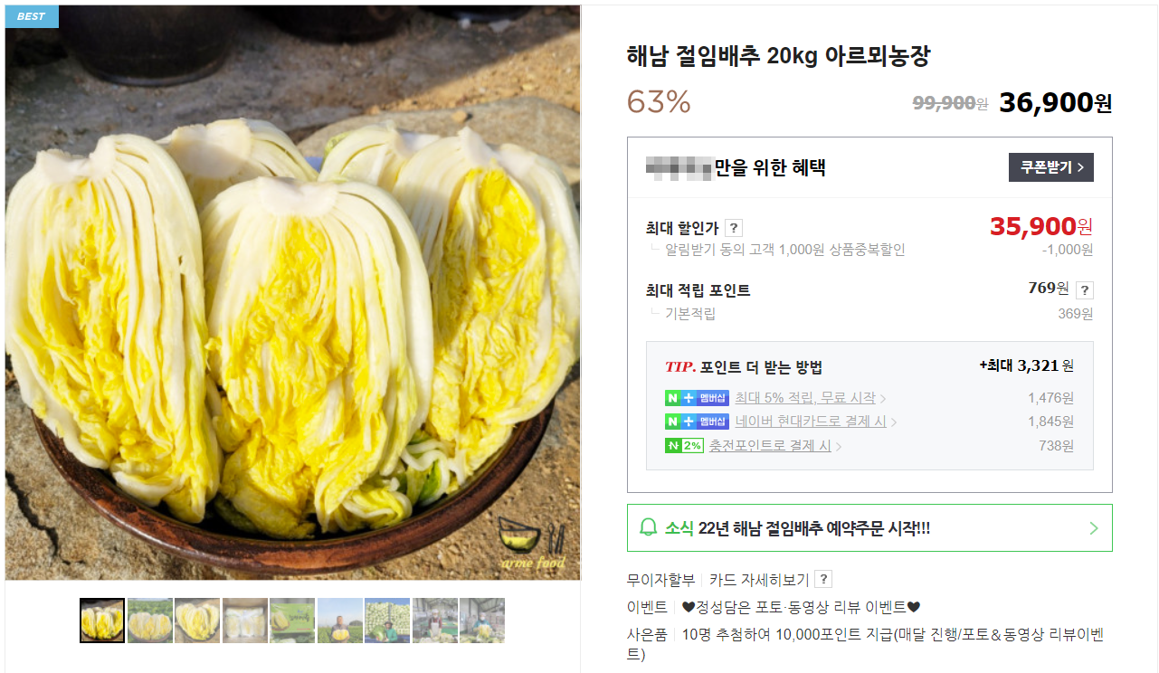 해남절임배추가 좋다는 것은 알았으니 이제는 가격을 알아보겠습니다. 요즘에는 네이버쇼핑 등을 통해서 직거래가 활성화 되어서 보다 합리적인 가격에 좋은 해남절임배추를 구매할 수 있게 된 것 같습니다. 제가 인터넷 검색을 통해서 확인한 내용을 정리해 보았습니다. 네이버쇼핑을 기준으로 리뷰 가장 많은 순으로 정렬했을 때 나오는 2개업체를 확인해 보았습니다. (사람들이 많이 구매하고 리뷰를 남겼다면 그만큼 신뢰도가 높다고 생각합니다.)