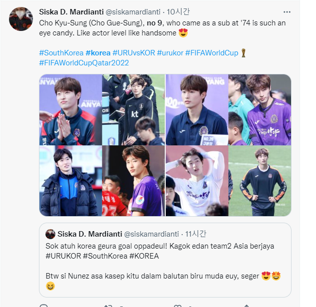 어제(2022년 11월 24일) 열린 우루과이 전 이후에 트위터에 "Korea No.9"을 검색하면 조규성 선수의 잘생긴 외모를 언급하는 트윗이 넘쳐났다고 합니다. 조규성 선수는 우루과이 전에서 후반 29분에 교체 출전하여 23분 정도 경기를 진행했습니다.
