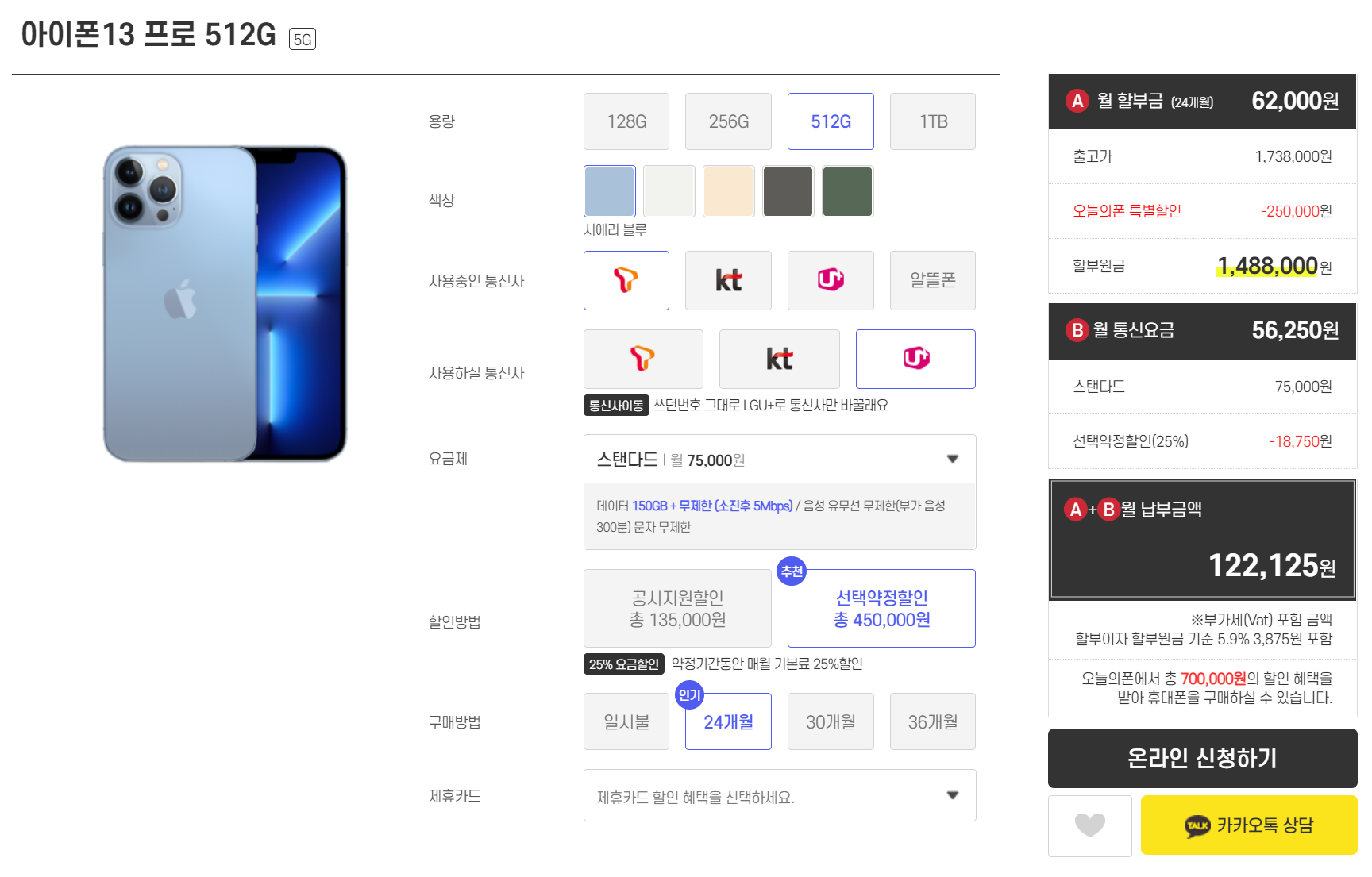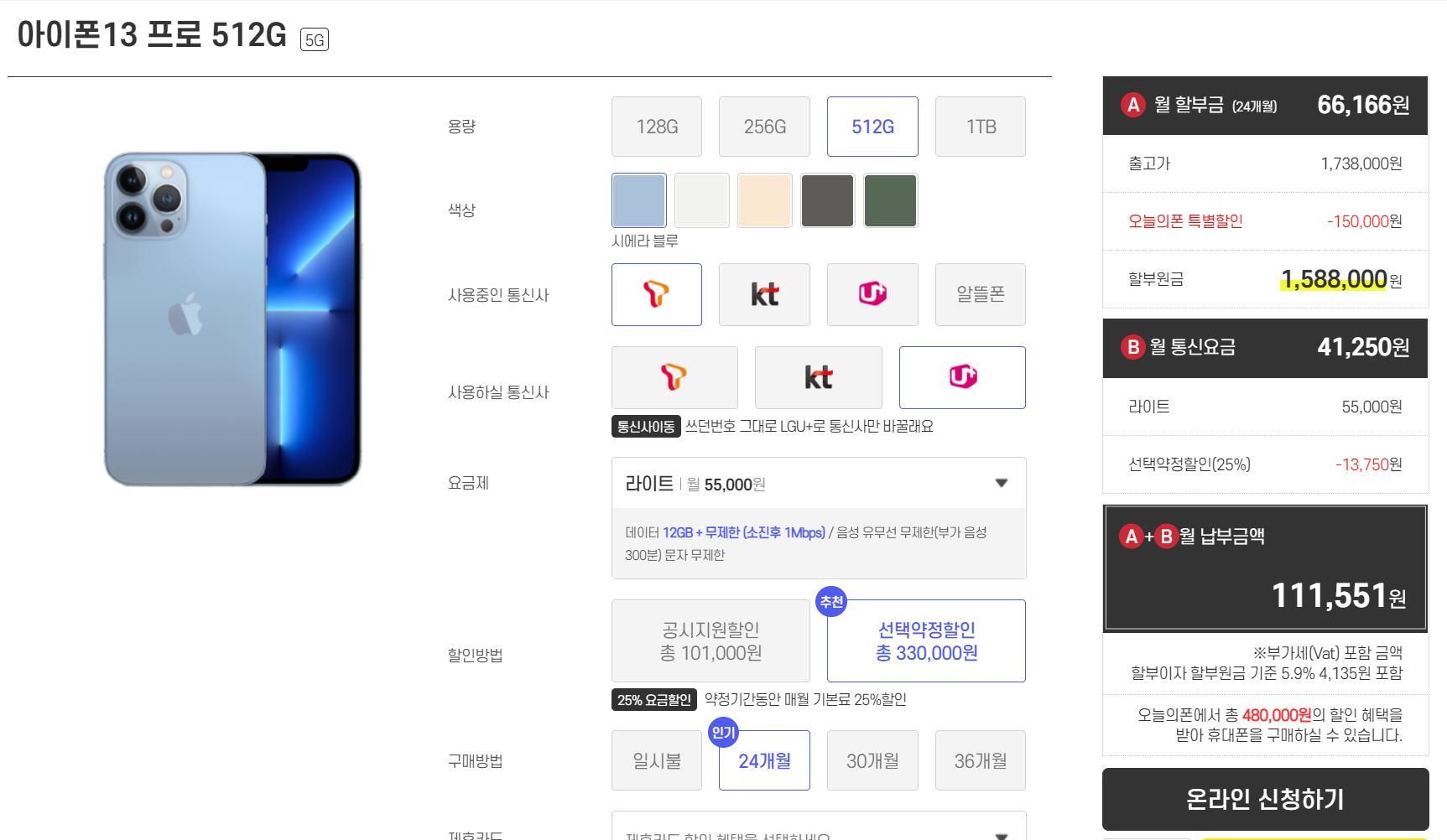 현재 쿠팡 사이트에서 아이폰 13 Pro 자급제폰(512GB)을 검색하니 164만 원으로 확인되어 이를 기준으로 비교할까 합니다. 성지를 확인할 수는 없어 그 대신 "오늘의 폰"이라는 사이트에서 특별 할인 가격을 확인하여 자급제폰+알뜰폰 요금제와 비교를 해 보았습니다.