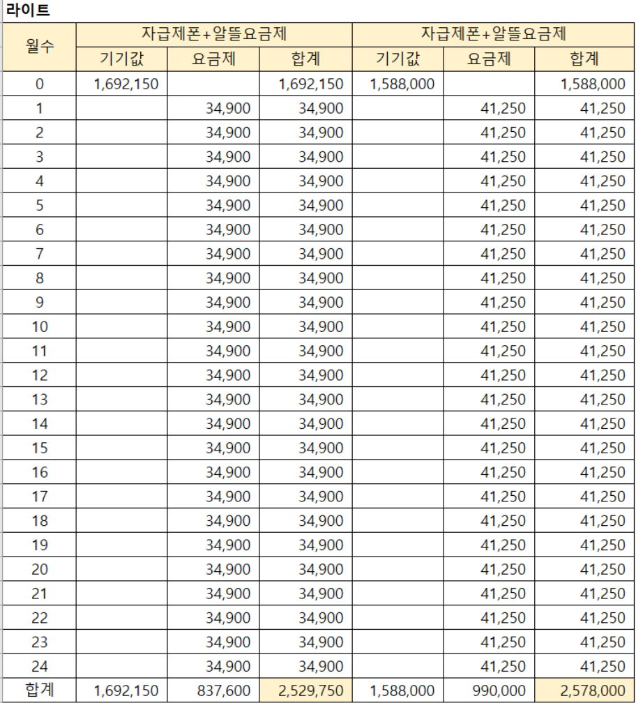 라이트요금제(12GB) 2,529,750원 2,578,000원 (-)48,250원